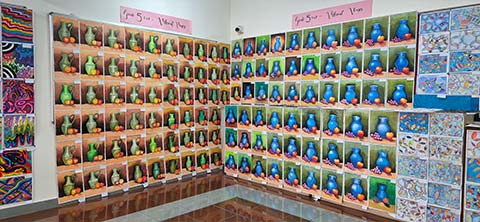 Grade 6 embraced abstraction with a dynamic interplay of bold colours and eccentric shapes, while Grade 5 students took a more classical approach with still life sketches of vases, apples and grapes. Grade 4’s artwork depicted interlocking circles forming ripples, with fish gliding through.