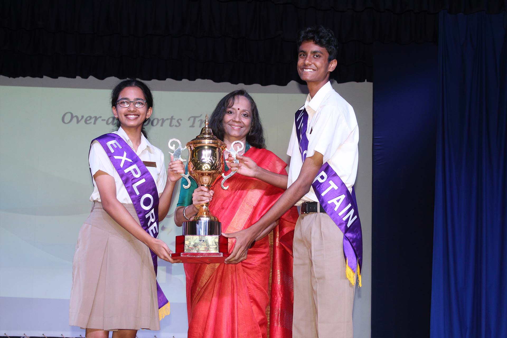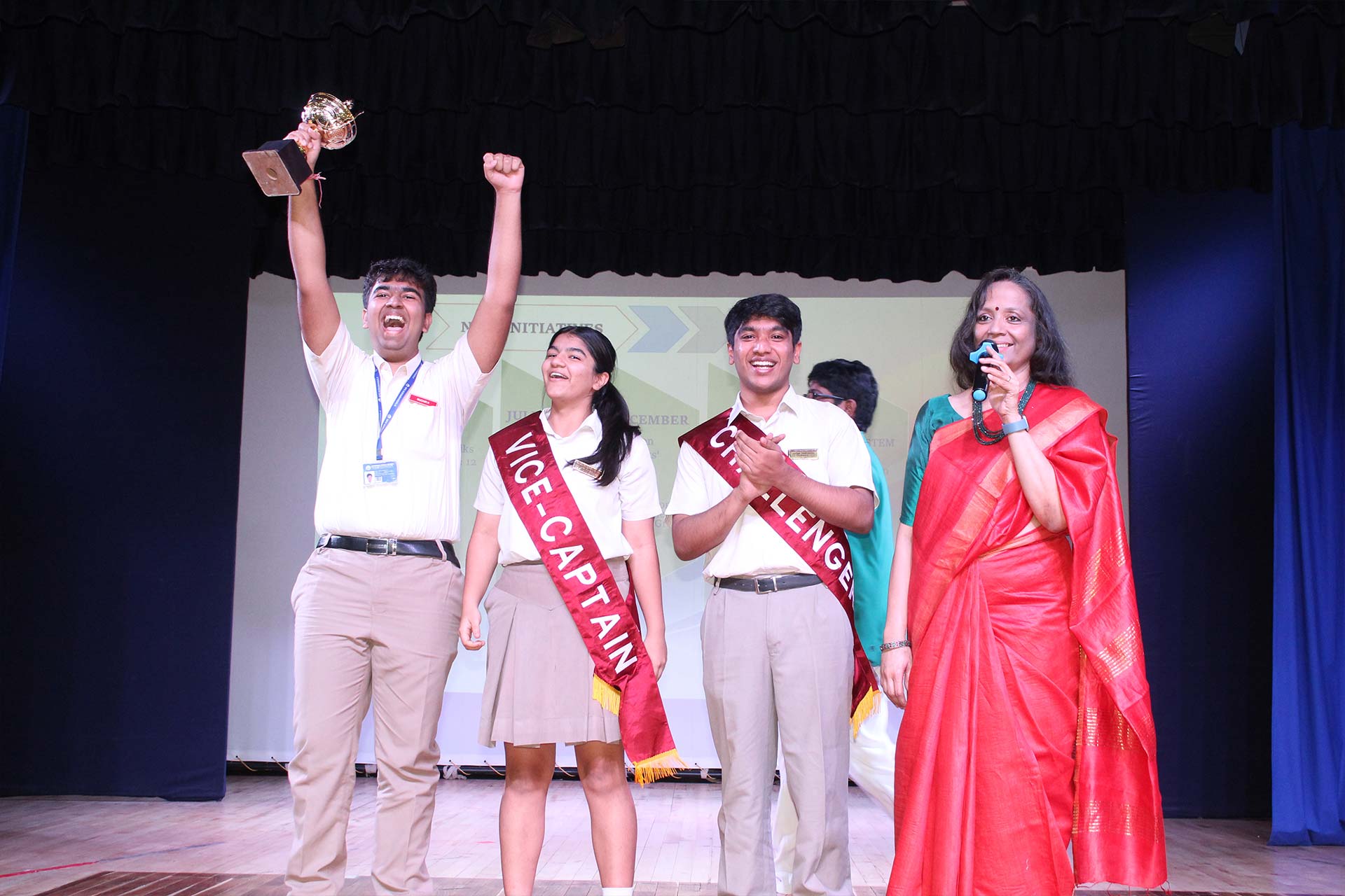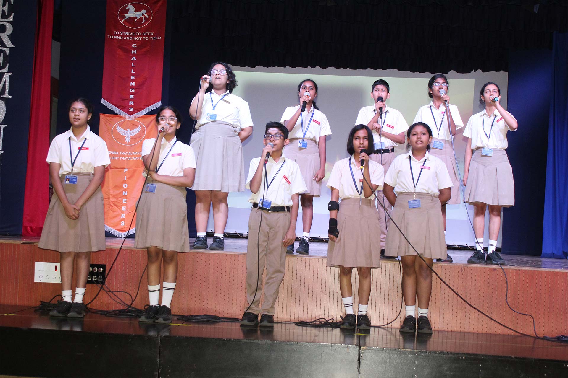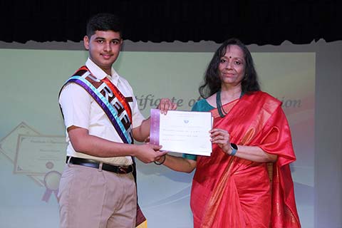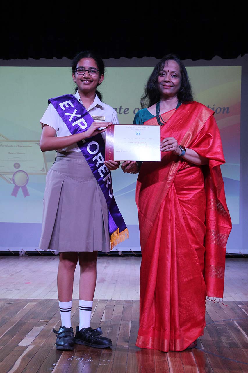 It was amazing to look back at the slew of year-long major and minor events, activities, and competitions covered in a compact presentation by the Principal Ms. Jyotsna Nair. The students’ exceptional achievements underscored the richness of these experiences. She also awarded the Inter-House Cultural Trophy to the jubilant Pioneers, the Overall Sports Trophy to the Explorers, and the Best Cheering Cup to the Challengers. Students of Grades 6-9 performed the song My Own Superhero, captivating the audience with its infectious rhythm.