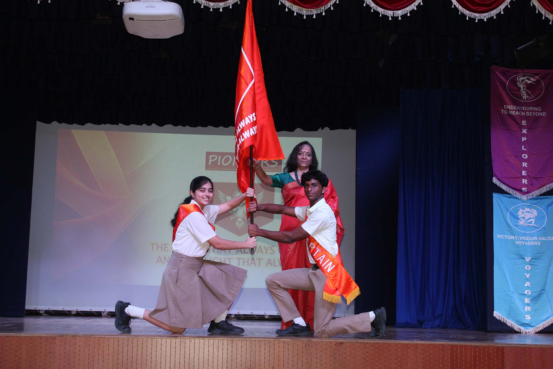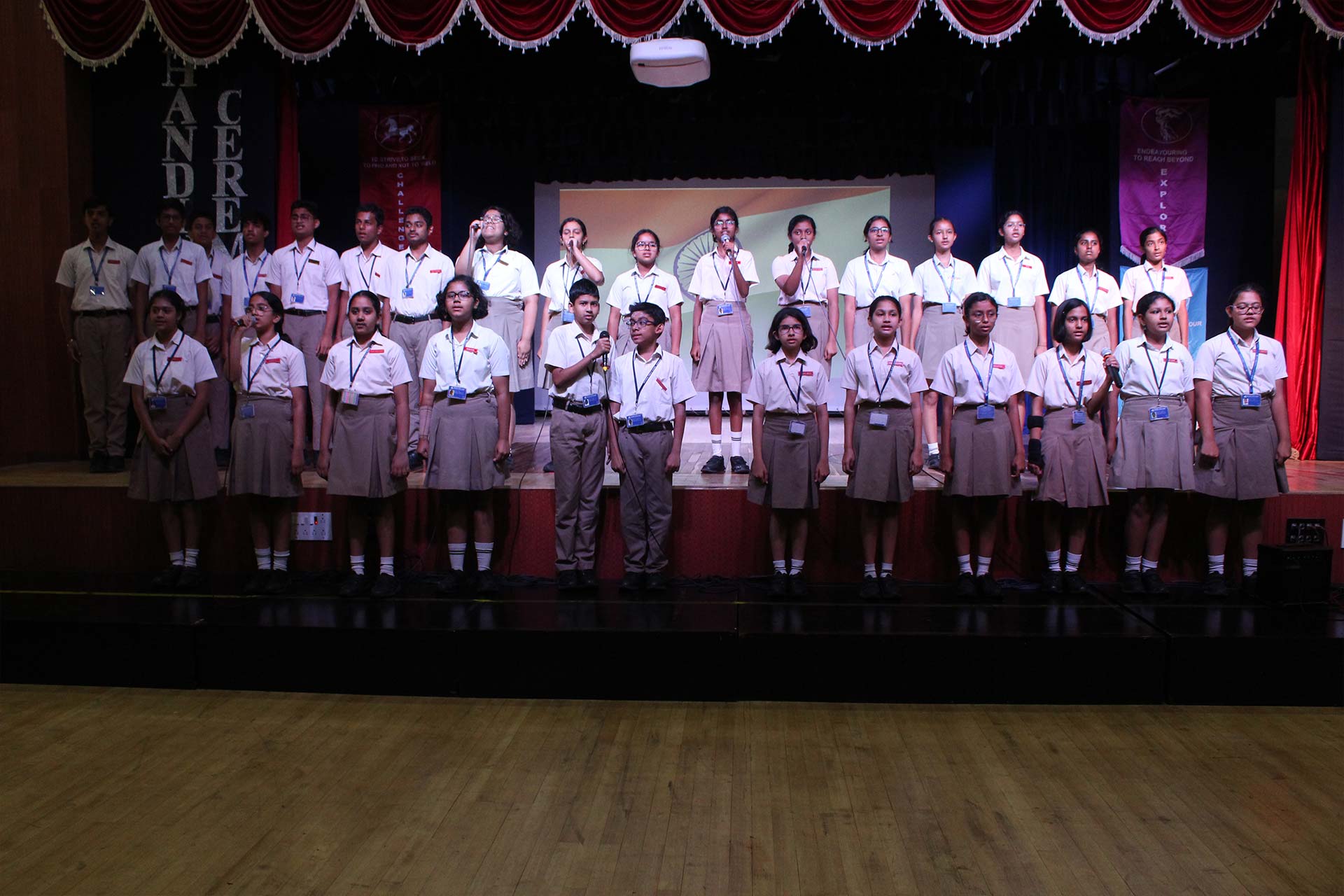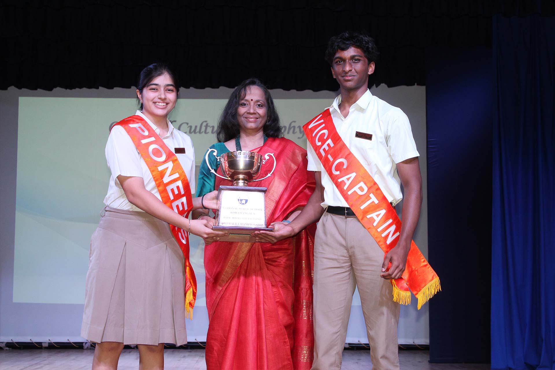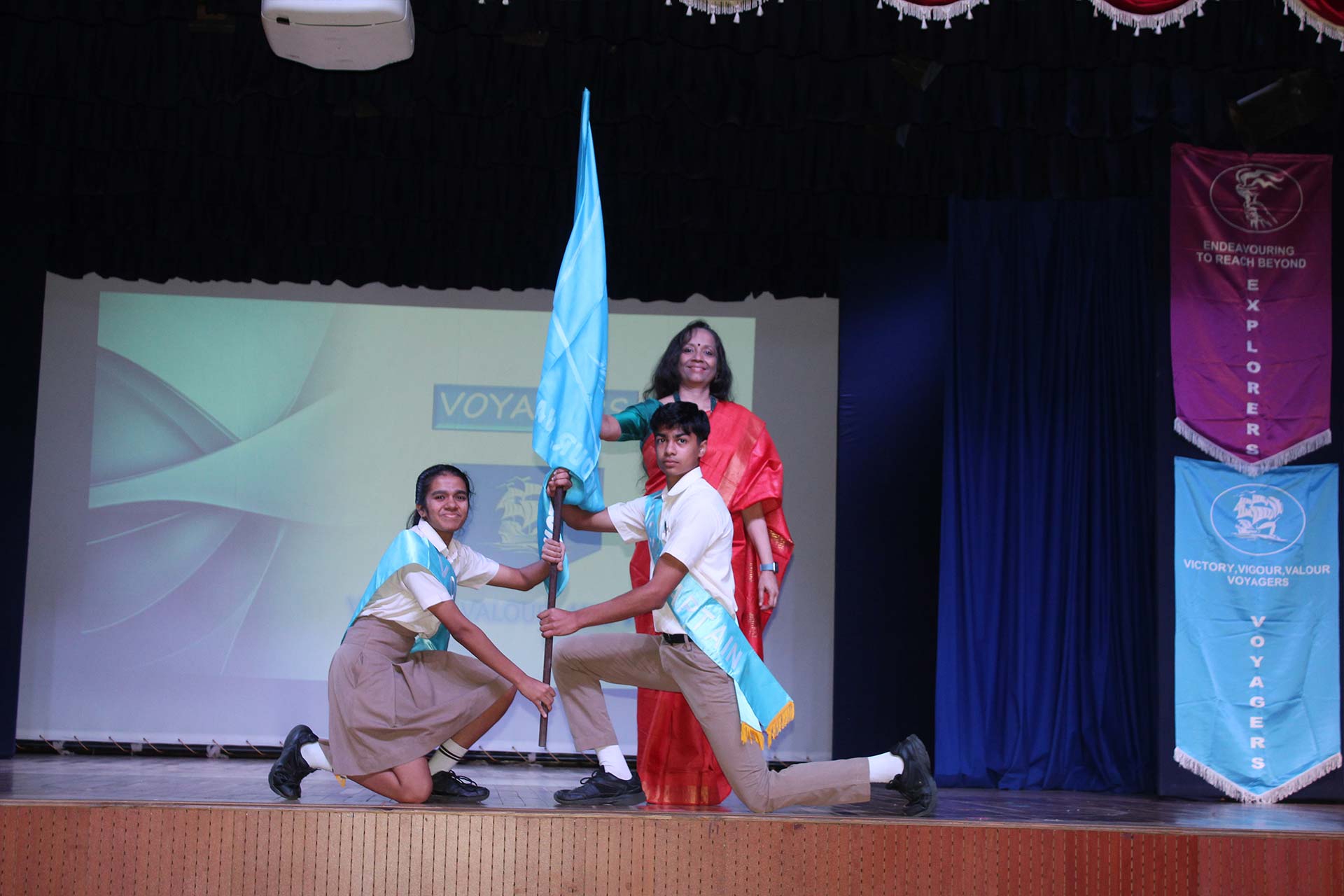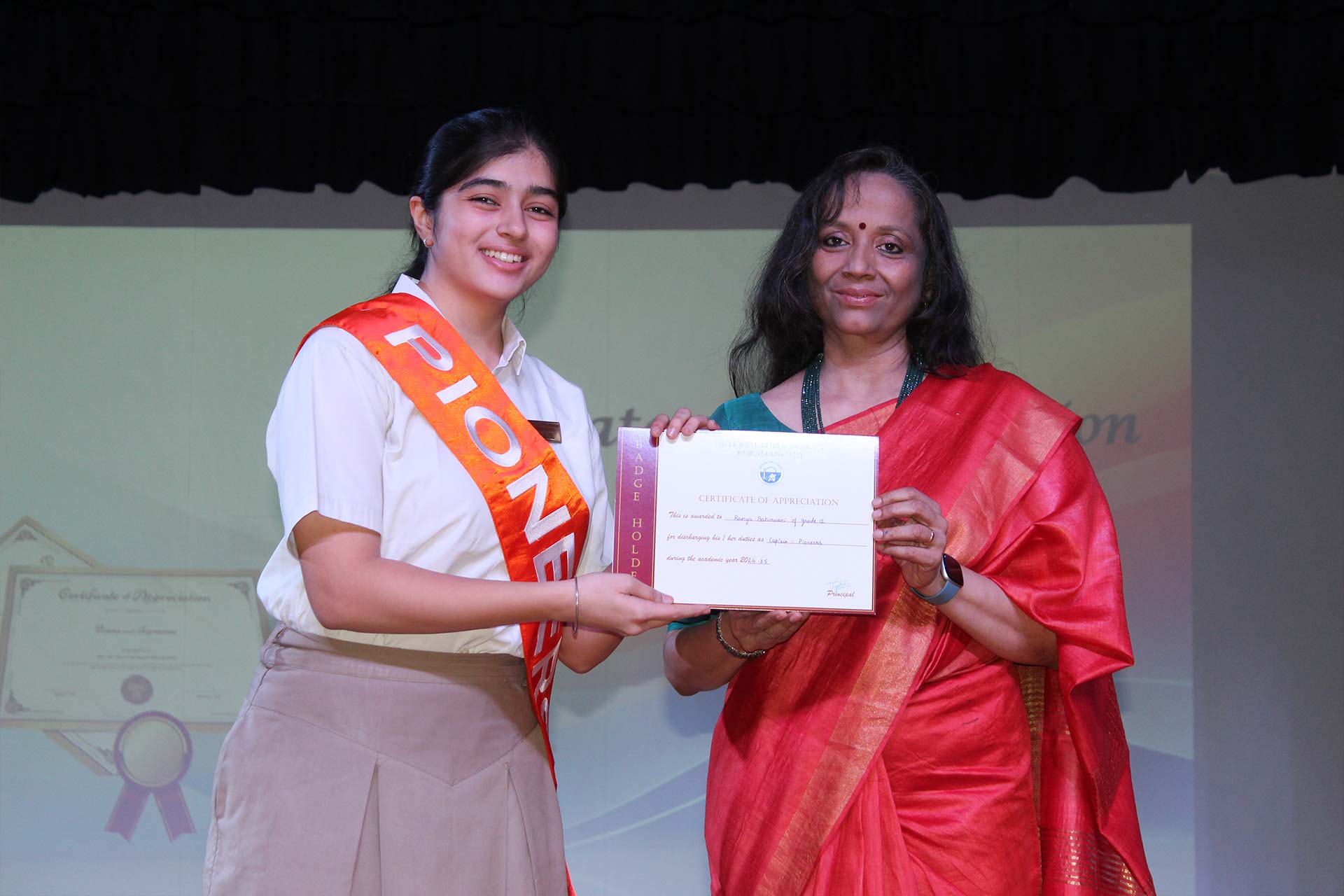 It was amazing to look back at the slew of year-long major and minor events, activities, and competitions covered in a compact presentation by the Principal Ms. Jyotsna Nair. The students’ exceptional achievements underscored the richness of these experiences. She also awarded the Inter-House Cultural Trophy to the jubilant Pioneers, the Overall Sports Trophy to the Explorers, and the Best Cheering Cup to the Challengers. Students of Grades 6-9 performed the song My Own Superhero, captivating the audience with its infectious rhythm.