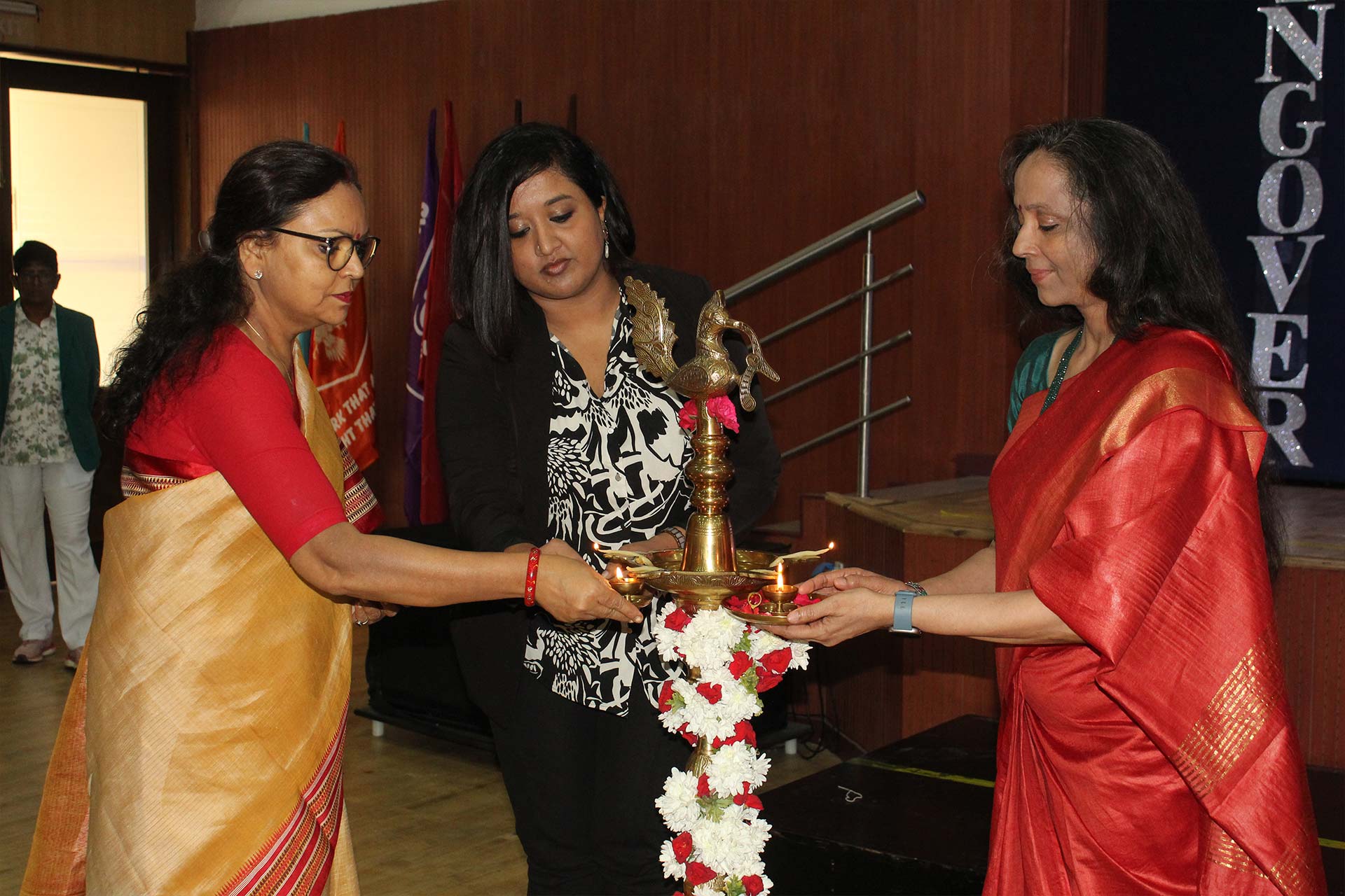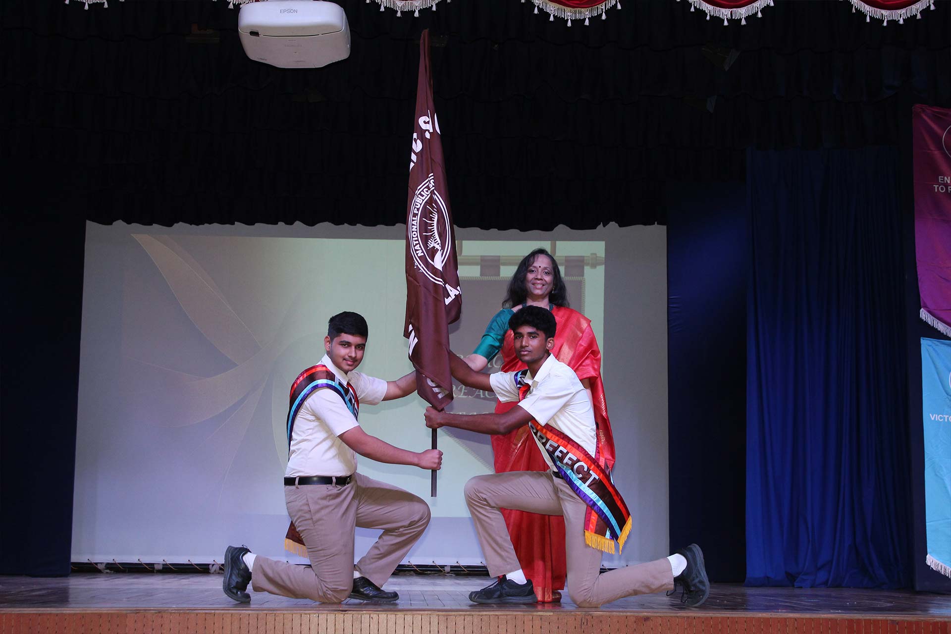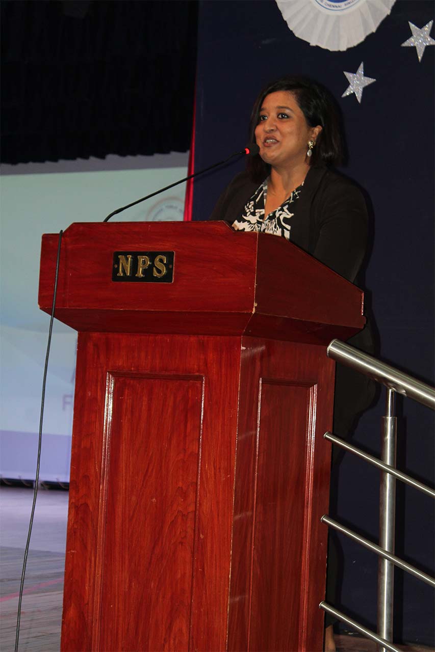 The event began with a warm welcome to the Guest of Honour, Ms. Meghana Srinivas, Founder and CEO of TrustIn, a legal tech company, and an esteemed NPS alumna from the Class of 2008, along with the Principal, Ms. Jyotsna Nair. As the ceremonial lamp was lit, students from Grades 6-9 invoked divine blessings with a harmonious fusion of Malayalam and Hindi prayers. Ms. Srinivas fondly reminisced about her school days and imparted valuable insights on the significance of learning and unlearning. This was followed by the Principal presiding over the symbolic exchange of the school flag and House flags, marking the official handing over of the leadership.