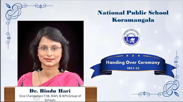 The Handing Over Ceremony, that signifies passing of the baton of responsibilities from the outgoing batch of Grade 12 to the Grade 11 leaders, was celebrated on 5th February 2022. Having coincided with the day of Basant Panchami, the students of Grades 8 and 9 rendered a beautiful invocation song - Namo Sarada, dedicated to the goddess Saraswati. Vice-chairperson Dr. Bindu Hari, in her address exhorted Grade 11 to perpetuate the NPS culture and live up to the legacy of excellence. Dr. Bindu also congratulated the students for making the major online events like AHAN (triennial cultural Fest), IRIS (Multidimensional Interschool Fest hosted by Grade 11) and Udyama (Grade 6 Entrepreneurial Program) a remarkable success. Later, the Grade 12 badge holders handed over the House flags to their Grade 11 successors, which is symbolic of bestowing the responsibilities. The school prefect, Aditya Raj reflected on the year that went by. He expressed gratification and gratitude at being able to achieve all the set goals with the support of management, faculty, and fellow students. In her speech, Principal Ms. Jyotsna Nair drew parallels from the lives of Michael Jordan and Henry Ford to motivate the students.
