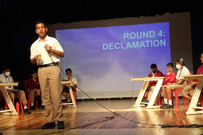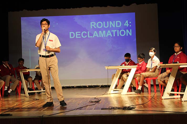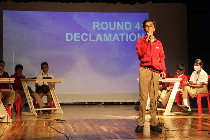 The fourth and final round was the declamation round, where two students from each house were assigned a prominent personality and had to deliver a speech given by that person. After 4 grueling rounds, it was finally time to announce the results. The Challengers team comprising Chinmay Jujare (8C), Anasuya, Sneho Roy (6A), Naomi Davis (7B), and Mukund Rathi (8B) bagged first place with an overall score of 85 points. The Voyagers comprising Adhya, Sreejani B (7B), and Sohham Joshi (8B) were the runners-up with 47 points. The Explorers comprising Ishan Kale(6B), Vaishakh V (7B), Mannan M and Hansini Prasanna (8C) bagged third place with 43 points. And finally, the Pioneers comprising of Sana Z (6A), Sachit B (7C), Akshay N (8A)and Iqjot K (8A) placed fourth with 18 points.