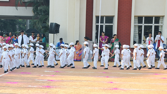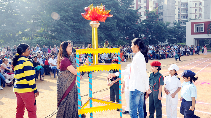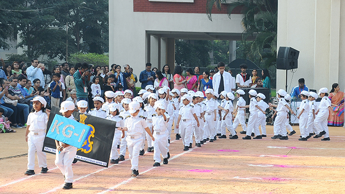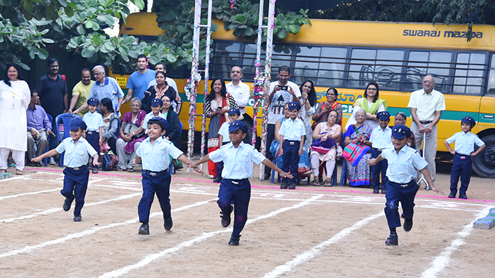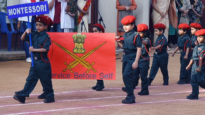 The event began with a torch relay. The flame which signifies the message of hope and inspiration was carried by the torch bearers and handed over to our Principal – Ms Jyotsna Nair, who declared the sports meet open. This was followed by a march past. The children of Montessori and Kindergarten marched in sync dressed as soldiers of the Army, Navy and the Air force.