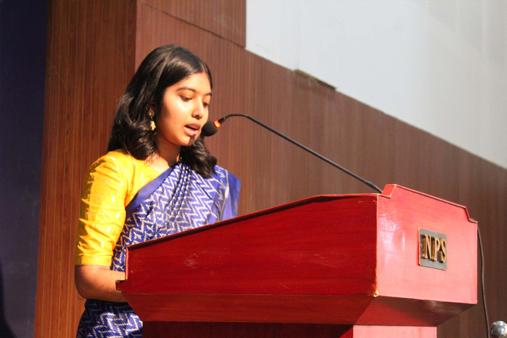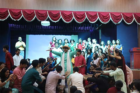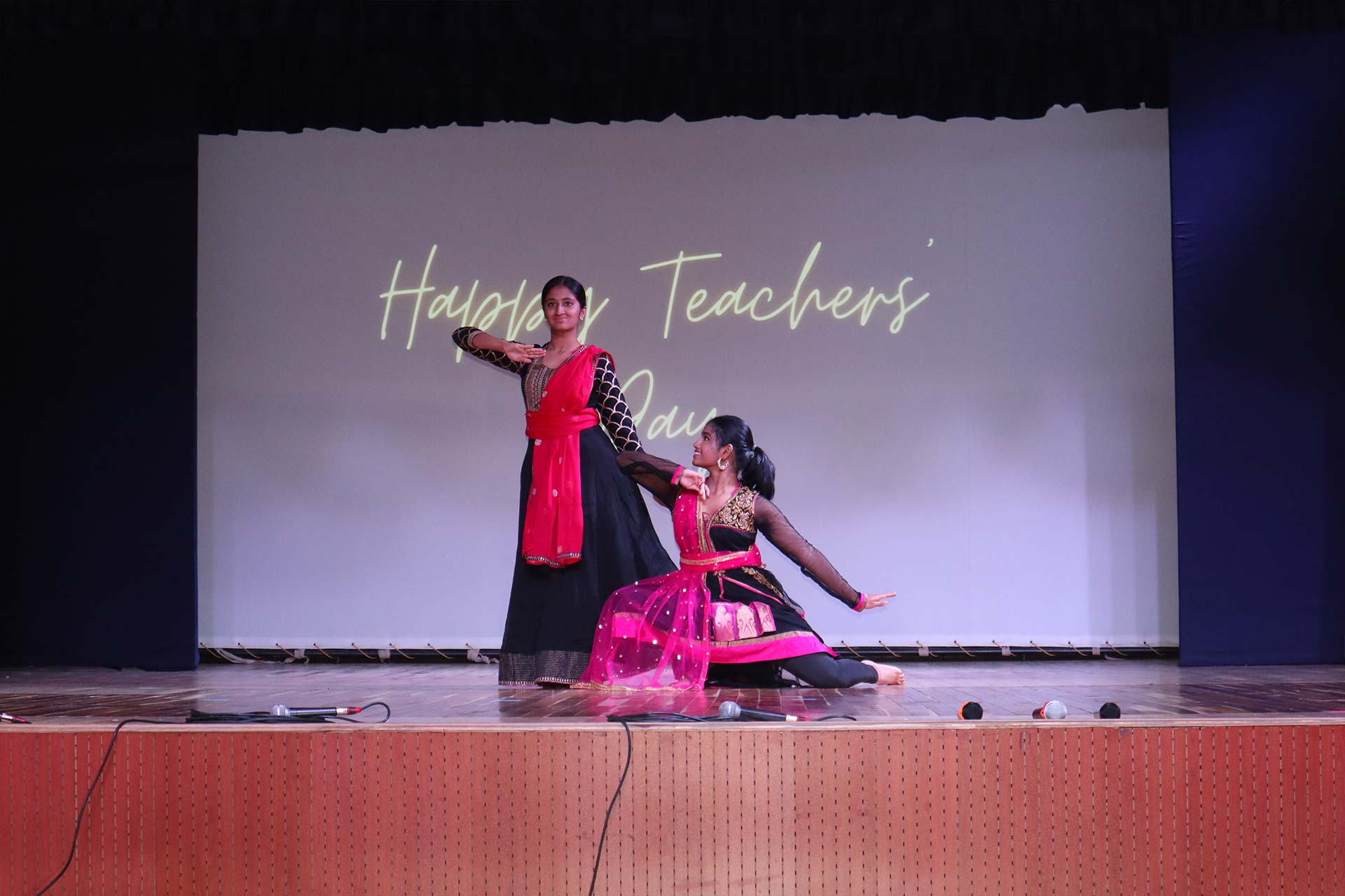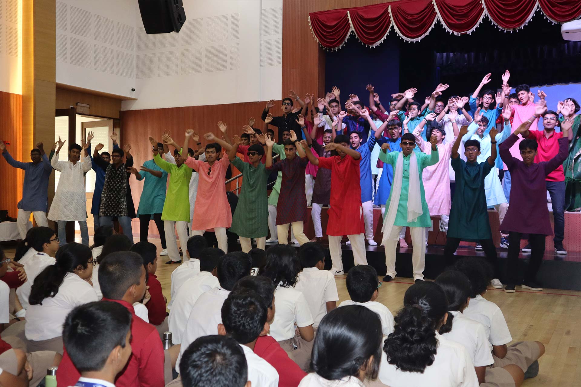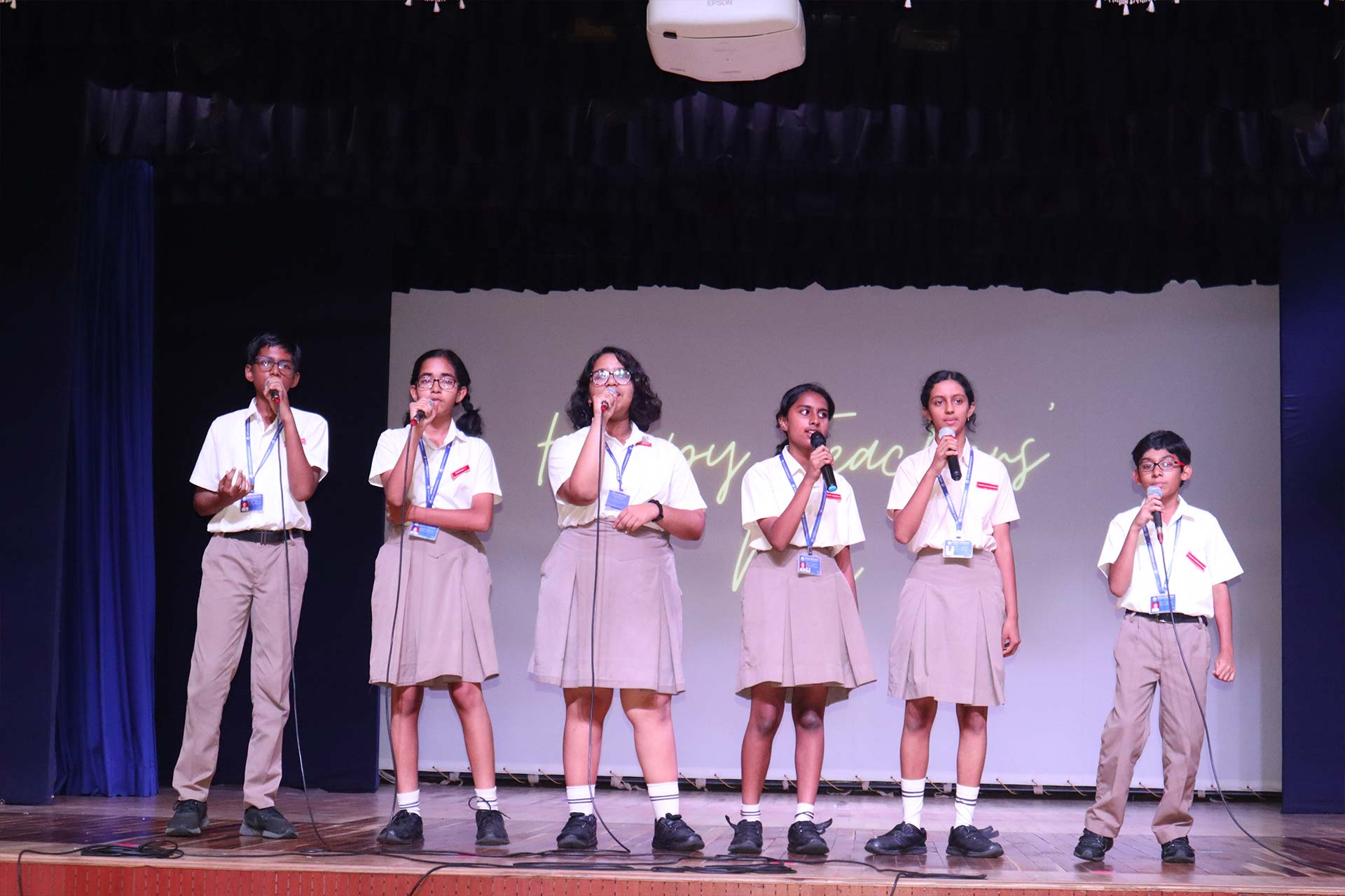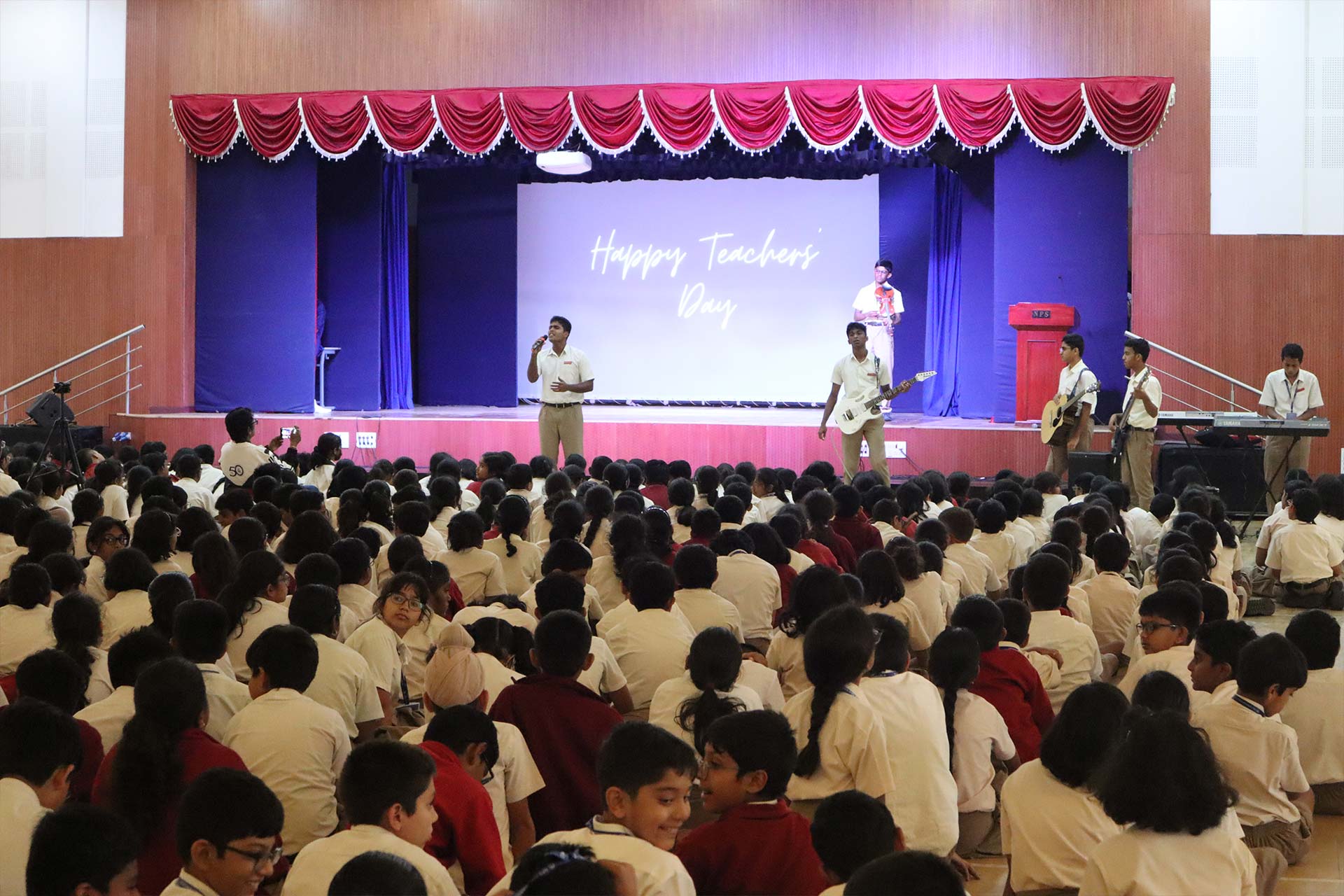 They sang; they danced, they emoted; they won the hearts of their teachers. Our students from Grades 6-12 expressed their reverence and affection for their teachers through a spectacular presentation on Teachers’ Day, celebrated on 5th September 2023. The programme commenced with the fluid motions of a classical dance by the students of Grades 9-11 followed by an original composition, set to enchanting music, by the students of Grade 10. A video, put together by Maitreyi Verma of 12A and her team, captured lovely shots of students pouring their hearts out for their teachers. The melodious symphony flowing from the violin, the keyboard, and the flute was a compelling ensemble that bound the admirers in rapt attention- presented by Martin A. Gomez of Grade 11, Kidambi Raghav, Tejasvi Karanth and Aryavir Mohanti of Grade 12. The mirroring of a usual day in the life of a teacher, by young students of Grades 6-8, was adorable as well as hilarious. The lingering lyrics of soulful Hindi, Kannada, and Tamil songs by the Middle School students swayed the hearts of one and all. The passion and the power of the Senior School band- with some amazing vocals by Shantanu K. (Grade 11) and Rishaan L. (Grade 10)- left the audience spellbound. However, what stole the show was the mind-blowing dance medleys set to hugely popular numbers by Grade 12 students, now a constant and irreplaceable feature of the Teacher’s Day programme every year.