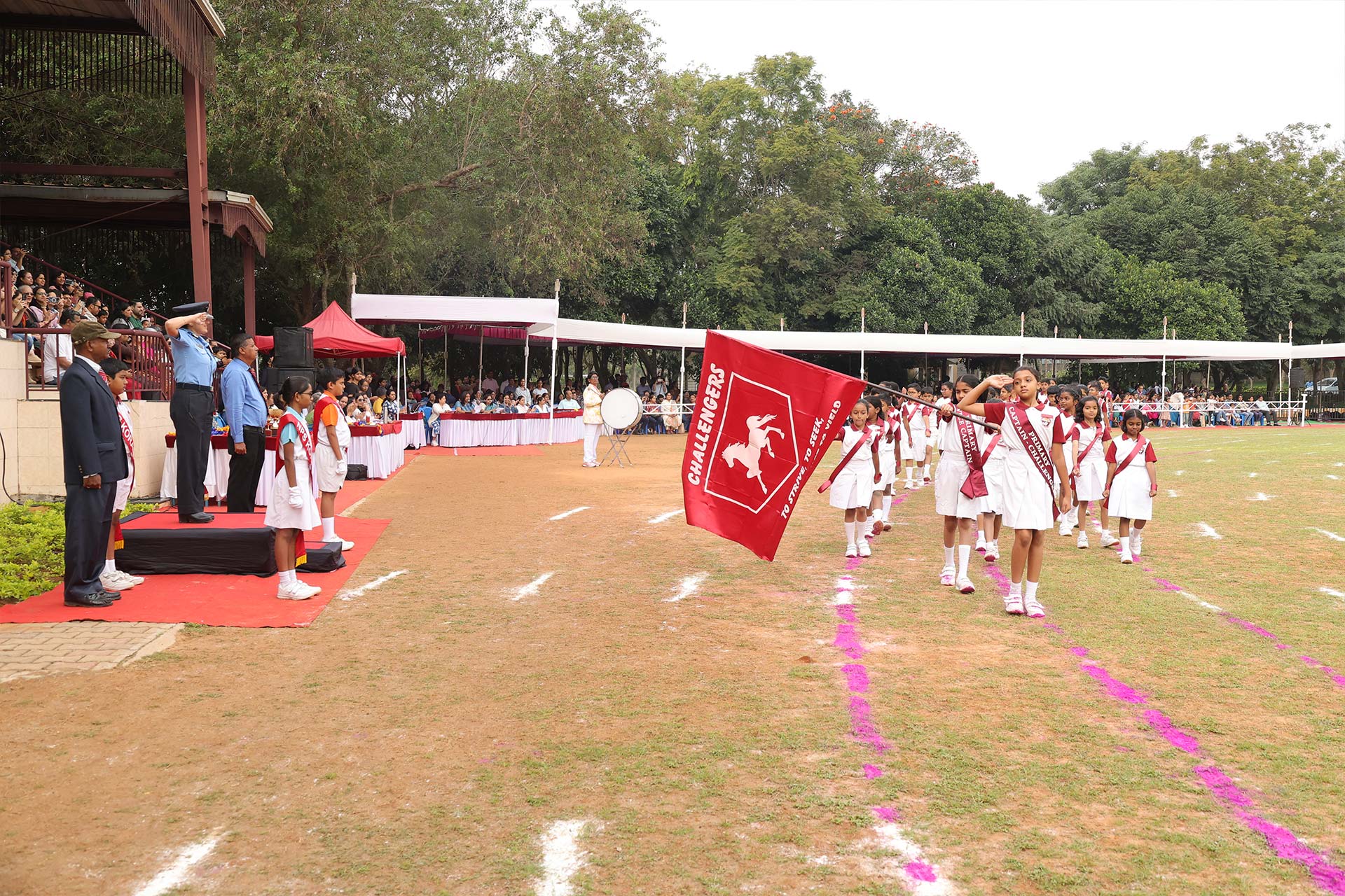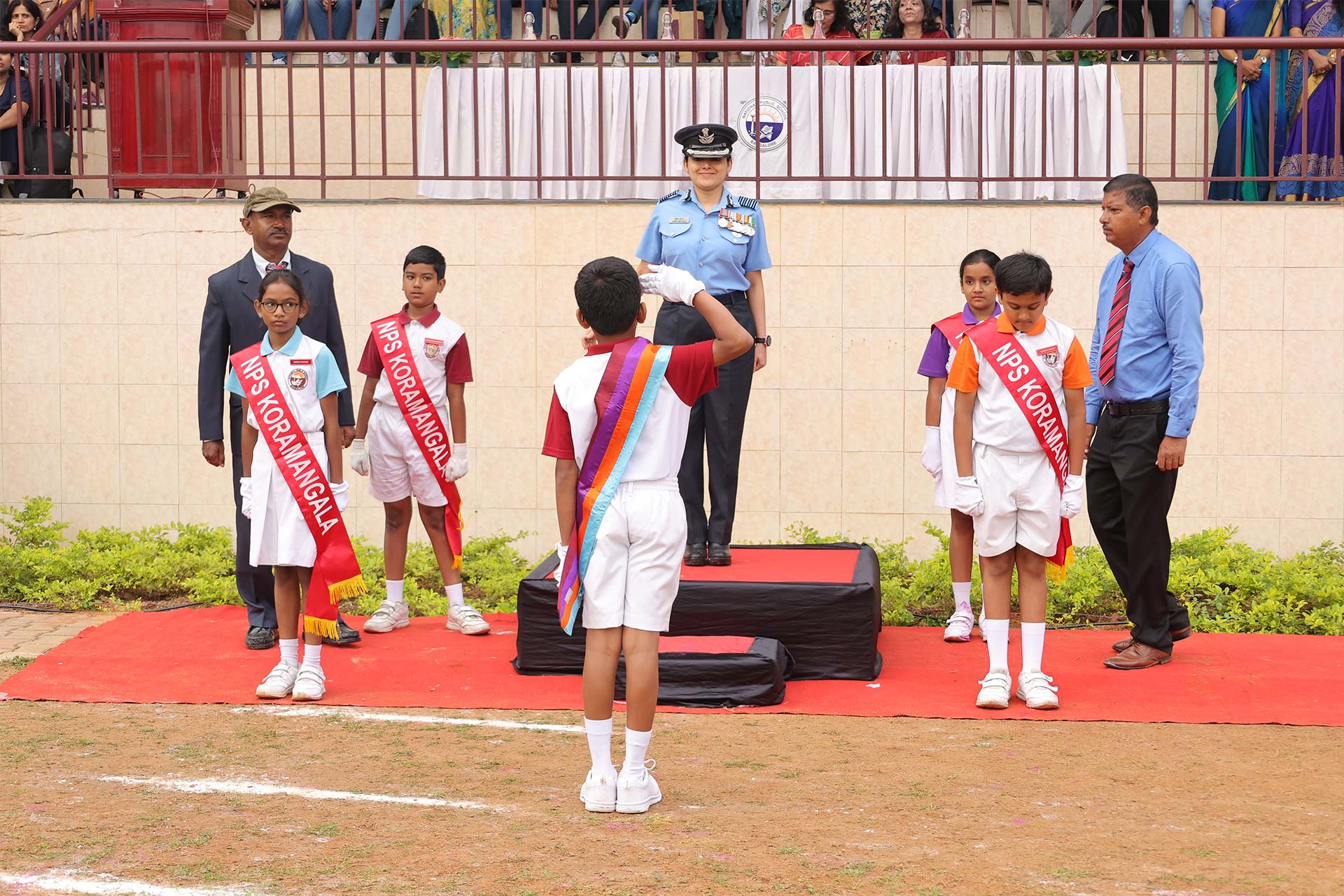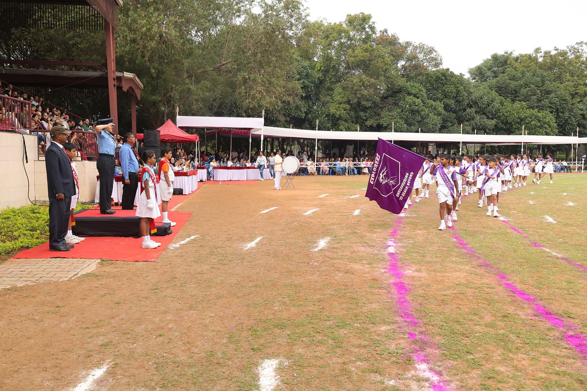 The event was graced by the chief guest Group Captain Deepthi Mutreja, who is a distinguished Pathologist at the Command Hospital Air Force. She also hails from an illustrious military background. For the opening ceremony, she was accompanied by the guard of honour comprising Aamya Rakesh, Adyant Singh, Sarah Zakkam and Suprateek Mohapatra of Grade 5 and was led by the Sports Captain Lavith S Urs and Vice-captain Aishani Singh with precision and poise. Following this was the official opening ceremony by the Principal, Ms Jyostna Nair. The March Past by the four houses, the Challengers, Explorers, Pioneers and Voyagers was a sight to behold and was appreciated by the chief guest.