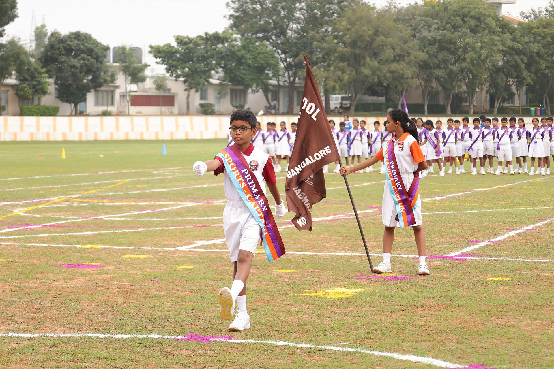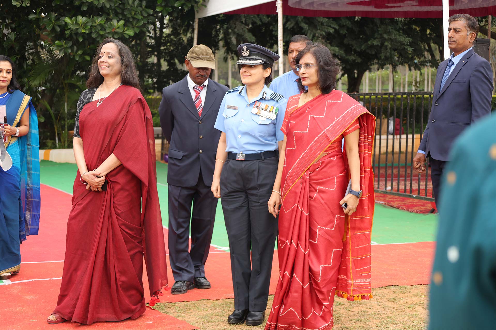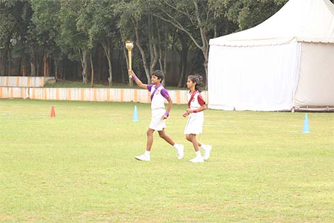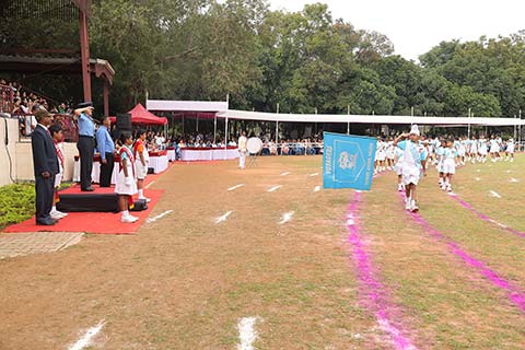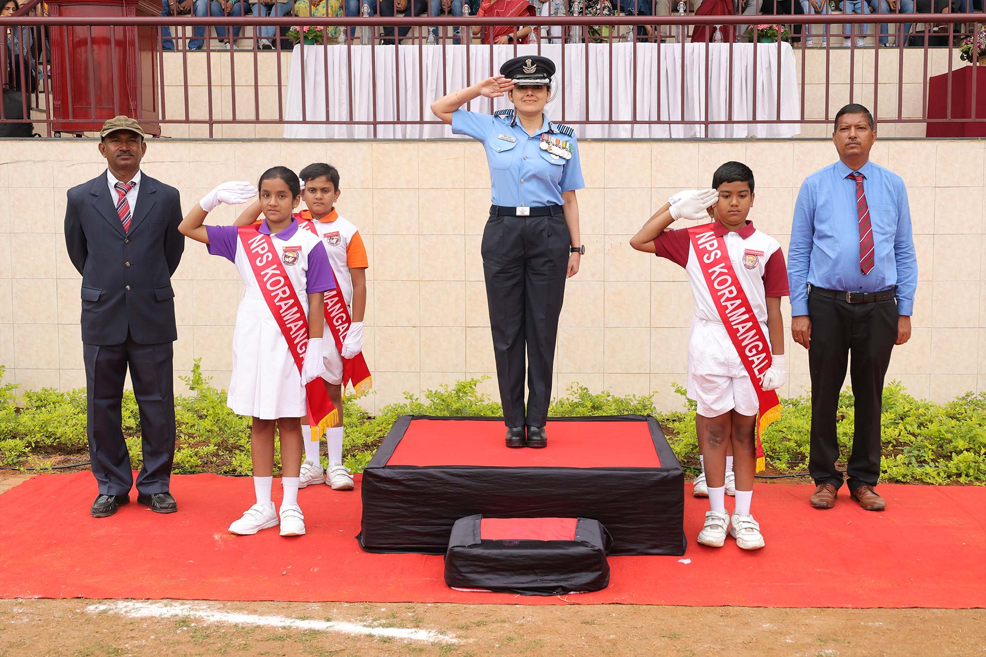 The event was graced by the chief guest Group Captain Deepthi Mutreja, who is a distinguished Pathologist at the Command Hospital Air Force. She also hails from an illustrious military background. For the opening ceremony, she was accompanied by the guard of honour comprising Aamya Rakesh, Adyant Singh, Sarah Zakkam and Suprateek Mohapatra of Grade 5 and was led by the Sports Captain Lavith S Urs and Vice-captain Aishani Singh with precision and poise. Following this was the official opening ceremony by the Principal, Ms Jyostna Nair. The March Past by the four houses, the Challengers, Explorers, Pioneers and Voyagers was a sight to behold and was appreciated by the chief guest.